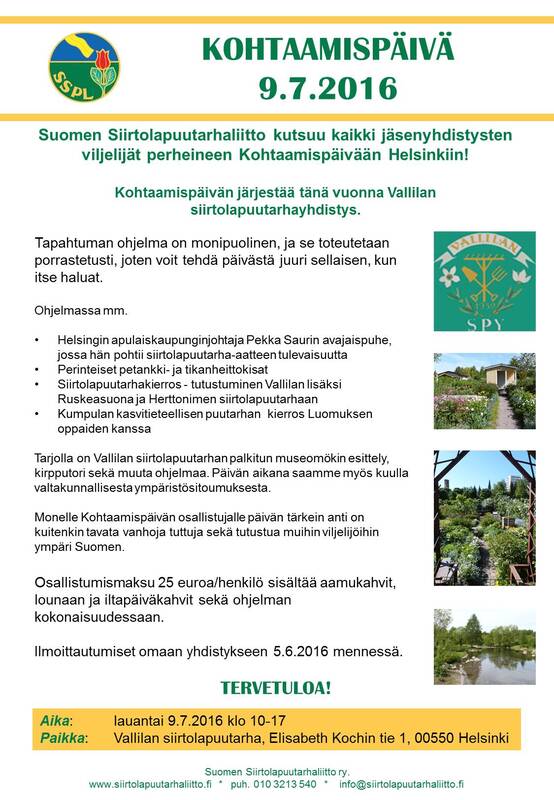 Siirtolapuutarhaliiton Vihervuosi 2016 -päätapahtuma on kaikkien viljelijöiden Kohtaamispäivä Vallilan siirtolapuutarhassa Helsingissä lauantaina 9.7.2016. OhjelmaPäivä alkaa ilmoittautumisella ja aamukahvilla klo 9 – varsinainen ohjelma alkaa klo 10. Klo 11-16 on erilaista ohjelma, josta jokainen osallistuja voi koota itselleen mieluisan yhdistelmän: