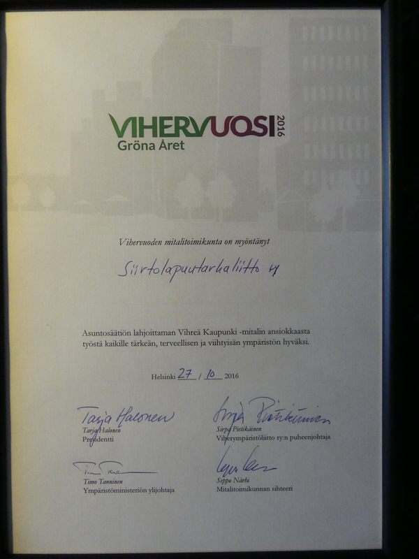 Vihervuoden päätöstapahtumassa Helsingin Säätytalossa jaettiin 27.10. 26 Vihervuoden mitaleja viheralan hyväksi tehdystä ansiokkaasta työstä. Mitalin nro 241 sai Suomen Siirtolapuutarhaliitto. Vihervuoden 2016 mitalitoimikunnan puheenjohtajana toimii presidentti Tarja Halonen. Toimikunnan jäseninä toimivat Viherympäristöliiton hallituksen puheenjohtaja Sirpa Pietikäinen ja ympäristöministeriön ylijohtaja Timo Tanninen, ja sihterinä Viherympäristöliiton pääsihteeri Seppo Närhi. Mitalin kunniakirjassa myöntämisen perusteena mainitaan 'ansiokas työ kaikille tärkeän, terveellisen ja viihtyisän ympäristön puolesta'. Vihreä kaupunki -mitalit ovat Asuntosäätiön lahjoittamia ja niitä myönnetään aina Vihervuoden yhteydessä. Ensimmäiset mitalit myönnettiin vuonna 1985, jolloin vietettiin ensimmäistä Vihervuotta. Vihreä kaupunki -mitalin on suunnitellut kuvanveistäjä Heikki Häiväoja. Mitalin etupuolta koristaa puiden ja pensaiden kaunistama kaupunkimiljöö sekä ensimmäisen Vihervuoden tunnus: ”Vihreys – Terveys – Viihtyisyys”. Toinen puoli kuvaa Espoon Kivenlahden Amfi-aluetta, joka on yksi Asuntosäätiön vihreän rakentamisen pääkohteista. Vihervuoden päätöstapahtumassa Suomen Siirtolapuutarhaliiton mitalin vastaanottivat liiton puheenjohtaja Pertti Laitila ja liiton sihteeri Tina Wessman. |