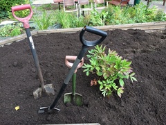 Istutusalueen kunnostamisen lisäksi vuonna 2018 uudistettiin seinänvierustalla oleva matalamultainen alue, johon istutettiin sekä yrttejä että perennoja. Puutarhasta kaadettiin pieni puu ja siinä jo olleet marjapensaat siirrettiin, jotta puutarhaan saatiin selkeämpi tila palvelutalon asukkaille - pelaamiselle ja oleskelulle.