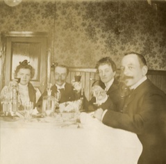 ![]() Kuva: Helsingin kaupunginmuseo. Kaksi naista ja kaksi miestä pöydän ääressä sisätiloissa. |