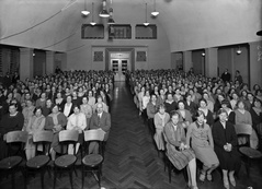 ![]() Kuva: Helsingin kaupunginmuseo. Luentotilaisuus Elannon leipämyymälöiden henkilökunnalle Elannon juhlasalissa 1930 |